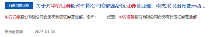 1月3日,安徽证监局在官网披露了《对华安证券股份有限公司合肥高新区证券营业部、李杰采取出具警示函措施的决定》。