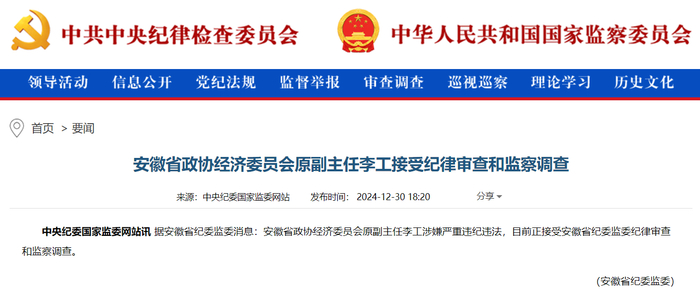 2024年12月30日,安徽省纪委监委发布消息,安徽省政协经济委员会原副主任李工,因涉嫌严重违纪违法,正接受安徽省纪委监委的纪律审查和监察调查。