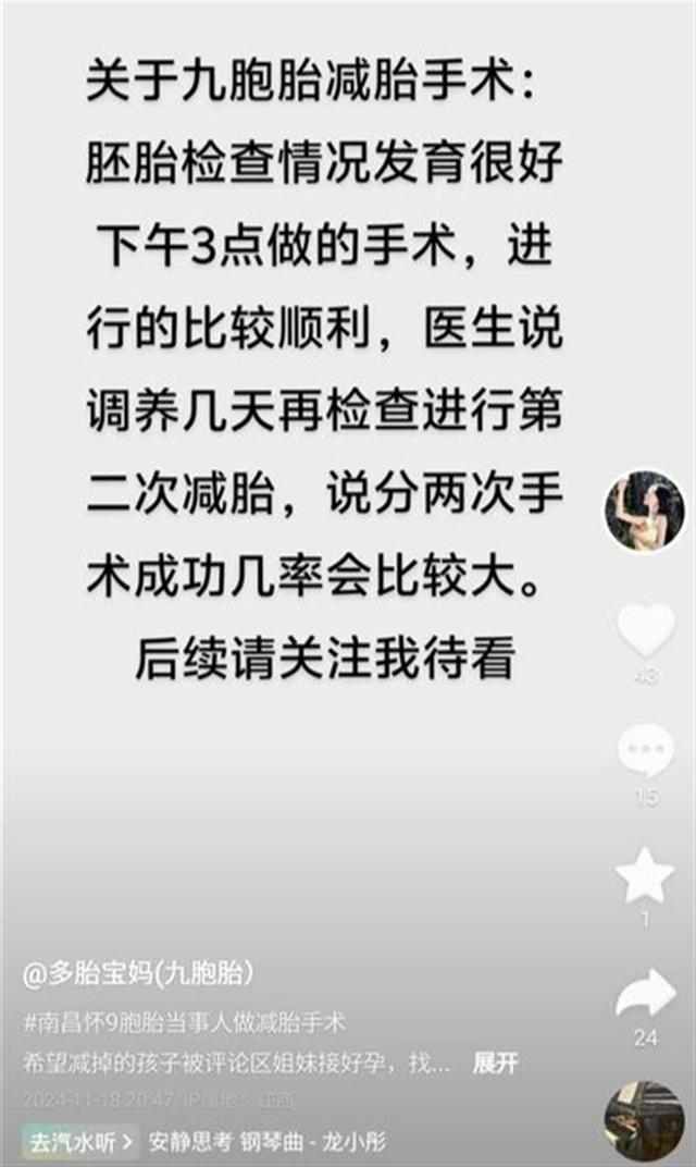 当月底,侯女士的丈夫曾晒出九胞胎减胎结果,两个胎心还在搏动,医生称确定已稳定,可以出院。