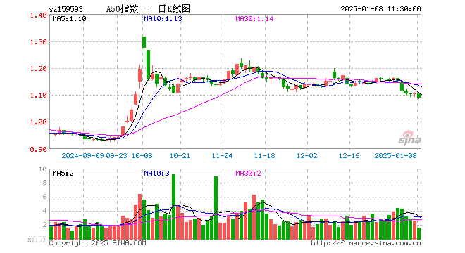 1月8日,截止午间收盘,中证A50指数ETF(159593)跌1.45%,报1.088元,成交额1.74亿元。中证A50指数ETF(159593)重仓股方面,贵州茅台截止午盘跌0.64%,宁德时代跌2.08%,中国平安跌1.18%,招商银行涨0.51%,美的集团涨0.22%,长江电力涨0.49%,紫金矿业跌1.31%,比亚迪跌2.71%,中信证券跌2.21%,恒瑞医药跌2.20%。