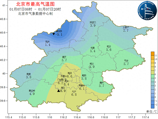 1月7日08时至20时,南郊观象台最高气温6.1℃(7日14:18)