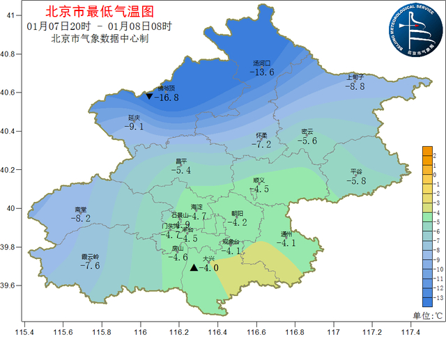 1月7日20时至8日08时,南郊观象台最低气温-4.1℃(8日07:52)