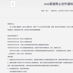公告显示,《三国志•战略版》将于2025年1月6日停止vivo渠道的注册,2025年2月5日停止vivo渠道的充值。此外,vivo渠道服玩家可申请退款,对于仍想保留游戏内的相关资产的玩家,也可联系客服协助资产找回。