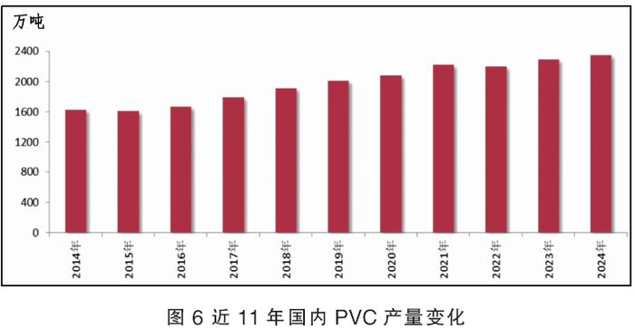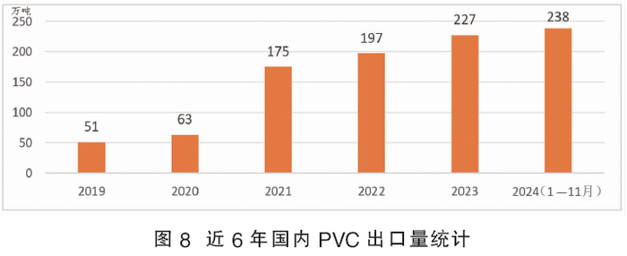 随着新增产能不断释放以及开工率提升,2024年国内PVC产量继续增加,预计总产量或达到2348万吨,刷新历史最高记录(见图6)。