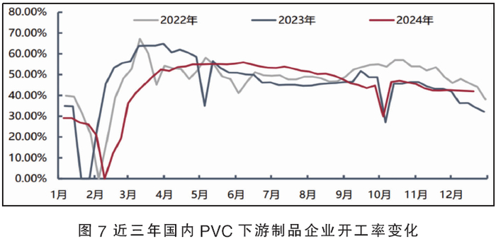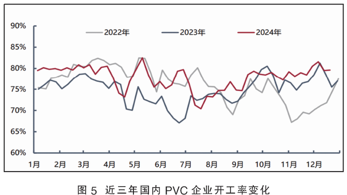 从近三年PVC行业开工水平来看,基本保持在七成至八成之间,且呈V型态势变化,即上半年震荡下滑,下半年逐步企稳回升(见图5)。2024年国内PVC开工基本上也在这个范围内运行,总体略高于前两年。