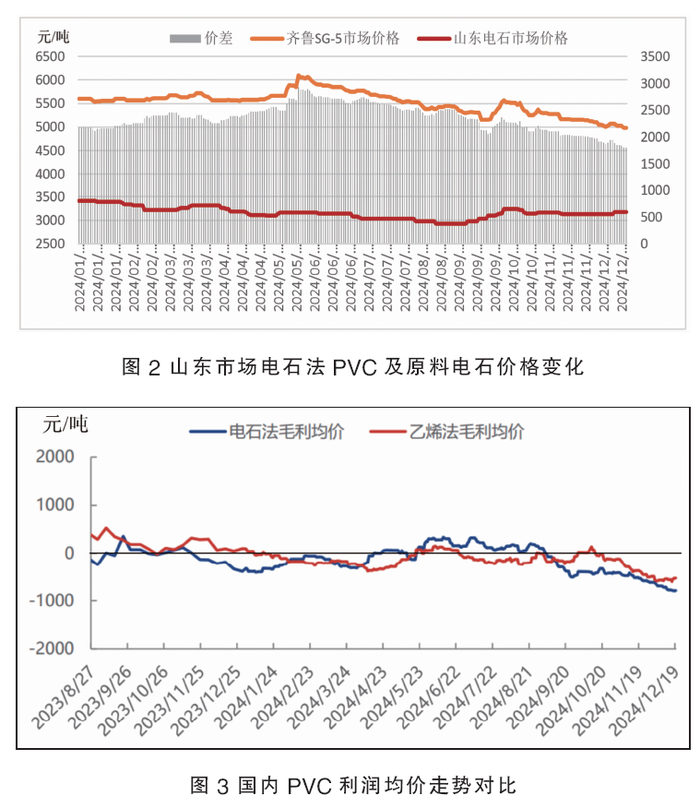 2024年国内聚氯乙烯(PVC)市场呈现震荡下行走势,行情整体表现低迷,市场重心再度下移(见图1)。电石法齐鲁市场SG-5型全年均价5520元/吨,同比2023年下跌7.68%;乙烯法常州市场S-1000全年均价5777元/吨,同比2023年下跌6.8%。年内最高点出现在5月下旬,最低点在12月下旬,其中齐鲁市场SG-5型创下2016年以来的最低价,常州S-1000市场价格刷新历史最低。