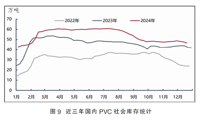 2025年,一揽子促进房地产市场止跌回稳措施显效,国内房地产市场继续下行空间不大,但真正好转可能要到2026年。另外考虑到地产宏观数据的改善传导到PVC需求有一定滞后,且房地产政策以保交房和消化存量为主,新开工数据或仍处于低位,对PVC市场支撑有限。因此2025年国内PVC需求难有明显好转,受宏观提振及政策影响下游开工或有短时走高,其余时间仍延续偏弱态势,总体下半年表现或好于上半年。
