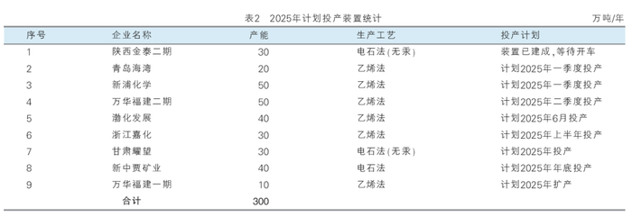 2025年国内PVC行业新投或扩能计划仍较多,初步统计有9套装置,合计产能300万吨/年,其中乙烯法装置6套,电石法装置3套,乙烯法占比继续提升(见表2)。除甘肃耀望和新中贾矿业有可能推迟到2026年投产外,其余7套装置大概率都会如期投产,成为近几年产能增速最快的一年,国内总产能将突破3000万吨/年。