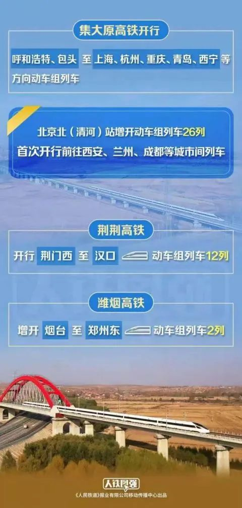 1月5日,全国铁路调整列车运行图,让乘火车回家过年的旅客有了更多选择。如:随着集大原高铁开通,内蒙古自治区深度融入全国高铁网,开行呼和浩特、包头至上海、杭州、重庆、青岛、西宁等方向动车组列车,旅行时间大幅压缩;北京北(清河)站增开动车组列车26列,首次开行前往西安、兰州、成都等城市列车;怀兴城际铁路大兴机场至廊坊北段开通运营后,增开廊坊北至北京西、天津西、石家庄、雄安间的动车组列车;增加廊坊、保定等环京地区车站停靠数量,增开北京北、清河至张家口间动车组列车14列等。