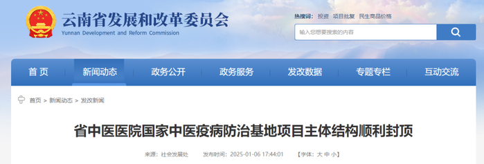 1月7日,健康君从云南省发展和改革委员会获悉,由云南省中医医院承建的国家中医疫病防治基地项目主体结构工程已经顺利封顶,预计2025年8月竣工验收,意味着云南省“十四五”期间又一卫生领域重大项目建设取得实质性进展。