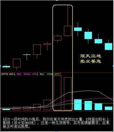 股价经过一段涨升后,如果某天出现了长上影线图线(或长实体图线),同时放出了大成交量,这种形态组合,就称为“顶天立地”。长上影图线(或长实体图线),像一柄长箭,直插天空,显示顶天之势。成交量栏里的量柱线,像孙悟空手中的“金箍棒”,立在地上,两者连起来看,就构成了“顶天立地”形态。
