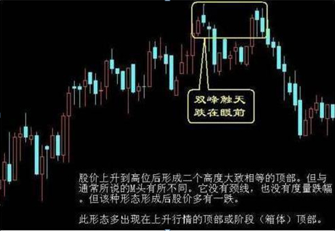 所谓“双峰顶天”,就是指股价上升到高位后,先后出现了两个高度大致相等的顶部,如同两个耸立云天的山峰,此种走势,就称之为“双峰顶天”即“M”头或“双顶”。“双峰顶天,跌再眼前”,是很可靠的卖出信号。