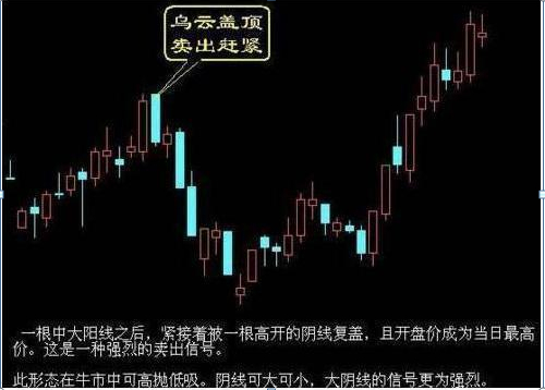 这里讲的“乌云”,是指股价上升到高位后,某日出现一条高开低走的大阴线,罩在前面一条阳线的头上,称之为“乌云压顶”。该形态的出现,表明获利盘在回吐筹码,股价将出现一段下调行情,应卖出股票。
