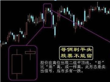 股价上升到高位后,如果相继出现了两组平顶线,就称为“兄弟剃平头”。该形态是由两组平定线组合起来的图线,所以卖出信号更为强烈。该形态的出现,表明投资者对当时的股价产生了疑虑,做多谨慎,不敢贸然行事,所以股价出现了两次平顶走势,后市只有通过回档整理才有可能重拾升势。回档的幅度,一般与前期升幅的大小有关。