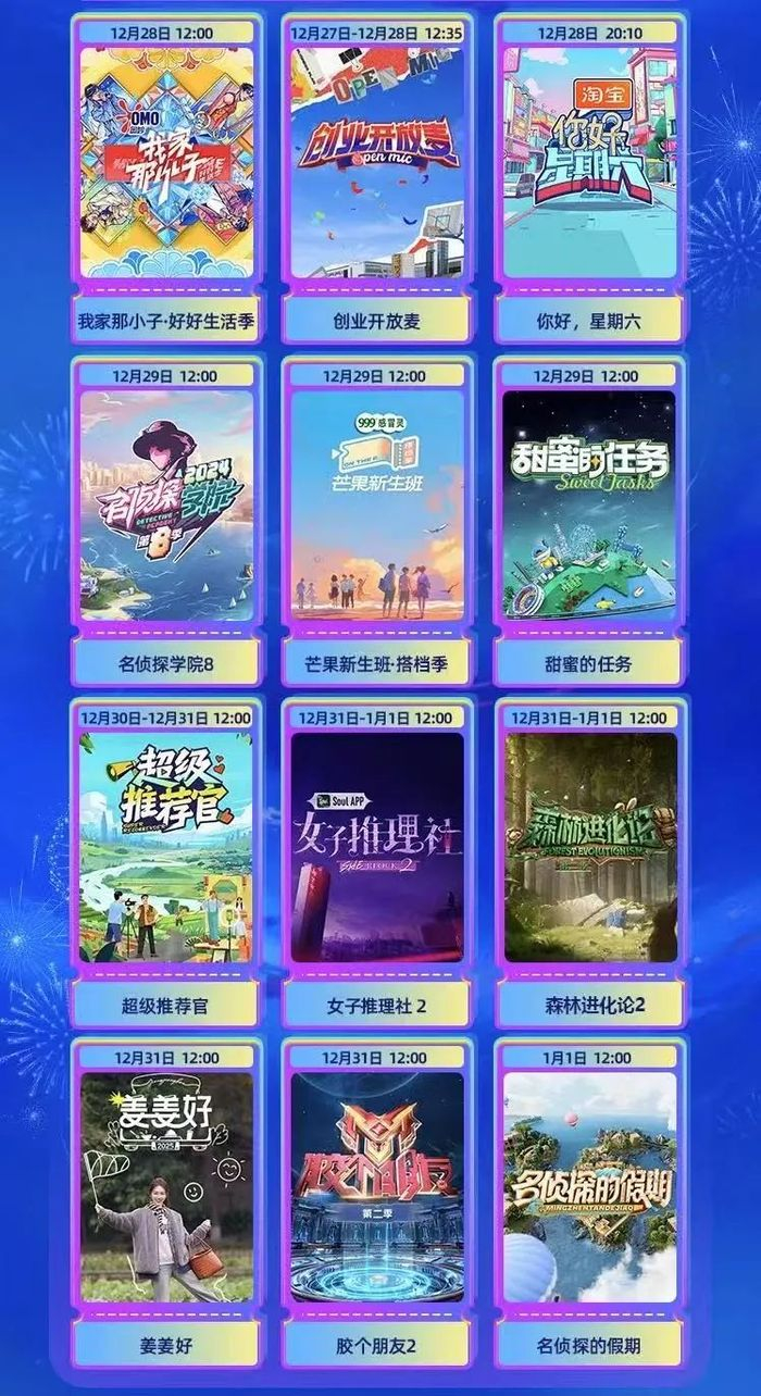 先说综艺,作为芒果TV的看家内容,无论在内容深度还是广度上都远超其他品类,在跨年片单中有12部综艺进入播出计划。