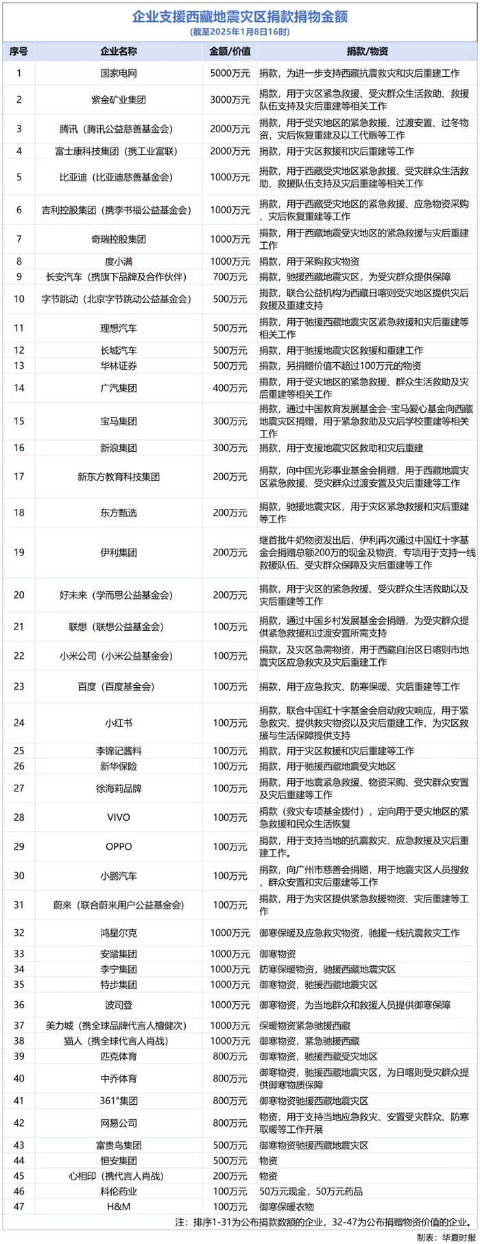 47家企业捐赠超3.3亿元驰援西藏灾区!国家电网、紫金矿业、腾讯等捐赠千万元以上