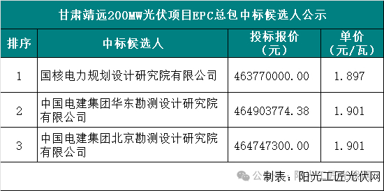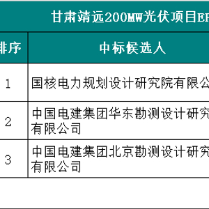 1月8日,靖远山发投新能源有限公司(靖远)B区20万千瓦光伏项目EPC工程总承包中标候选人公示,国核电力规划设计研究院有限公司以1.897元/瓦位列第一候选人,该价格不含组件价格。