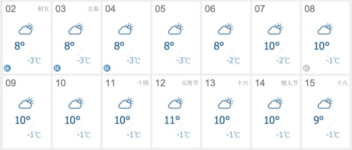 今天下午到夜里,晴天间多云。东北风3级左右,阵风5级左右。最高气温:5到6度。最低气温:零下5度到零下4度。
