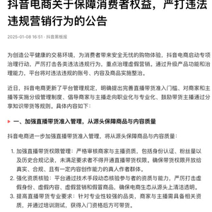 1月8日,抖音电商安全中心发布公告称,抖音电商启动专项治理行动,严厉打击各类违法违规行为,重点治理虚假营销。此外,抖音电商更新了平台管理规定,明确提出完善直播带货准入门槛、对商家和主播等实施分级管理制度、倡导商家与主播走向职业化与专业化、鼓励带货主播通过分享知识带货等规则。抖音电商表示,将进一步加强直播带货准入管理,确保带货权限开放给真实、合规、且有一定内容创作能力的真人作者群体。针对专业性较强的品类,商家与主播需具备相关资质,并通过培训测试,获得入门资格后方可带货。