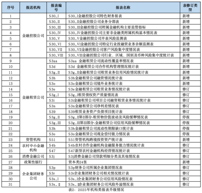 机构类报表新增38张表,修订12张表,停报4张表。(修订内容见表2↓)