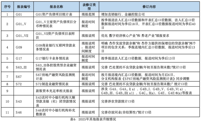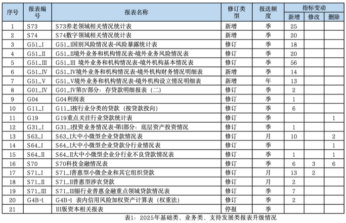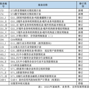 基础类、业务类、支持发展类报表新增4张表,修订16张表。共涉及新增指标217项,调整指标5项,删除指标11项。此外旧版资本相关报表停报。整体来看,升级主要涉及科技金融、普惠金融、养老金融、数字金融、企业融资等方面,并加强对信贷风险、国别风险等管控,对金融机构的数据采集要求进一步提升。(修订内容见表1↓)