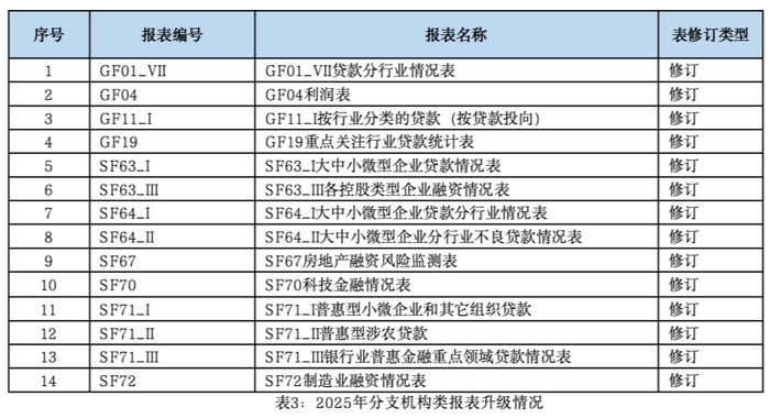 分支机构类报表修订14张表。(修订内容见表3↓)