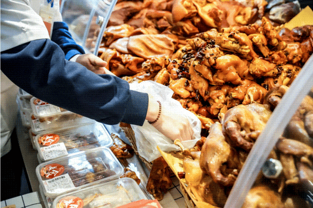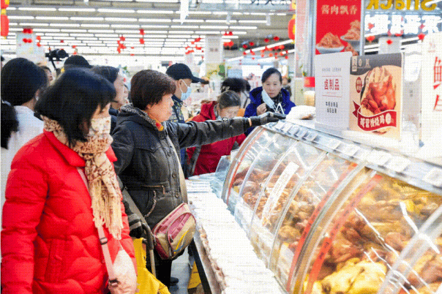 熟食也是本次焕新的重点。品种上,既有全国统一的推动,如煌上煌品牌卤味,自制烤鸡、爆款牛肉条、小香肠等;也有各种地方特色及现场炖煮等,如盐水鸭、荷叶鸡等,丰富的品种,诱人的色泽,腾腾的热气及怡人的香气,具象化地诠释了什么是人间烟火。