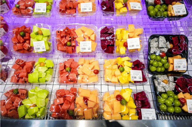 入口处的果切区一样令人瞩目。门店精选各种新鲜水果当日制作,各种拼盘依照甜度的不同,贴心地标明了食用顺序;价格更是全面“祛魅”,如蜜瓜果切双拼,门店定价14.9元,价格线较同行低2元,还有多种9.9元款;同时,基于鲜度,4小时8折,6小时6折。