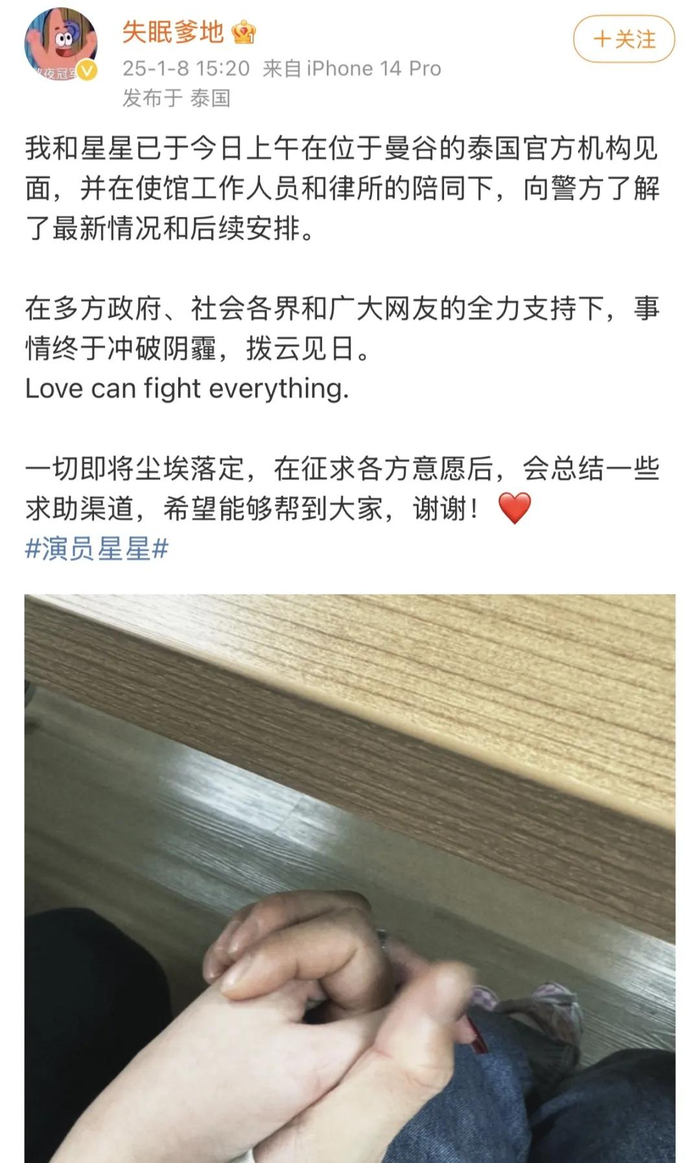 1月8日下午15点20分,演员王星女友 @失眠爹地 发文称,“我和星星已于今日上午在位于曼谷的泰国官方机构见面,并在使馆工作人员和律所的陪同下,向警方了解了最新情况和后续安排”,并附上与星星的牵手图。
