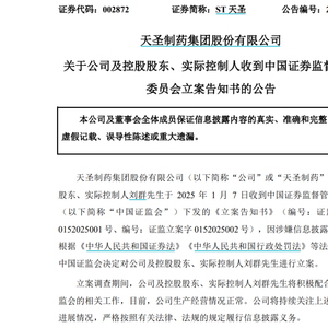 因涉嫌信息披露违法违规,ST天圣及实际控制人被立案调查
