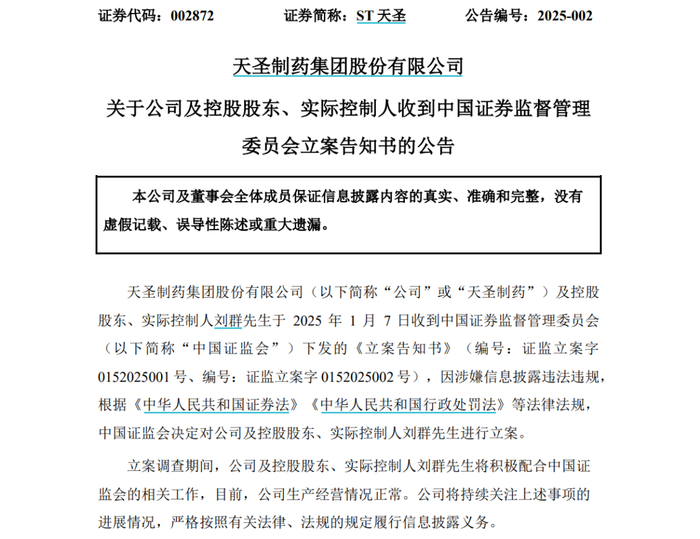 ST天圣表示,立案调查期间,公司及控股股东、实际控制人刘群将积极配合中国证监会的相关工作。目前,公司生产经营情况正常。