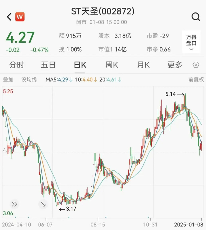 截至1月8日,ST天圣报4.27元/股,总市值为14亿元。
