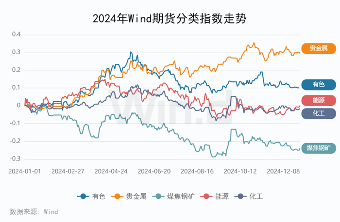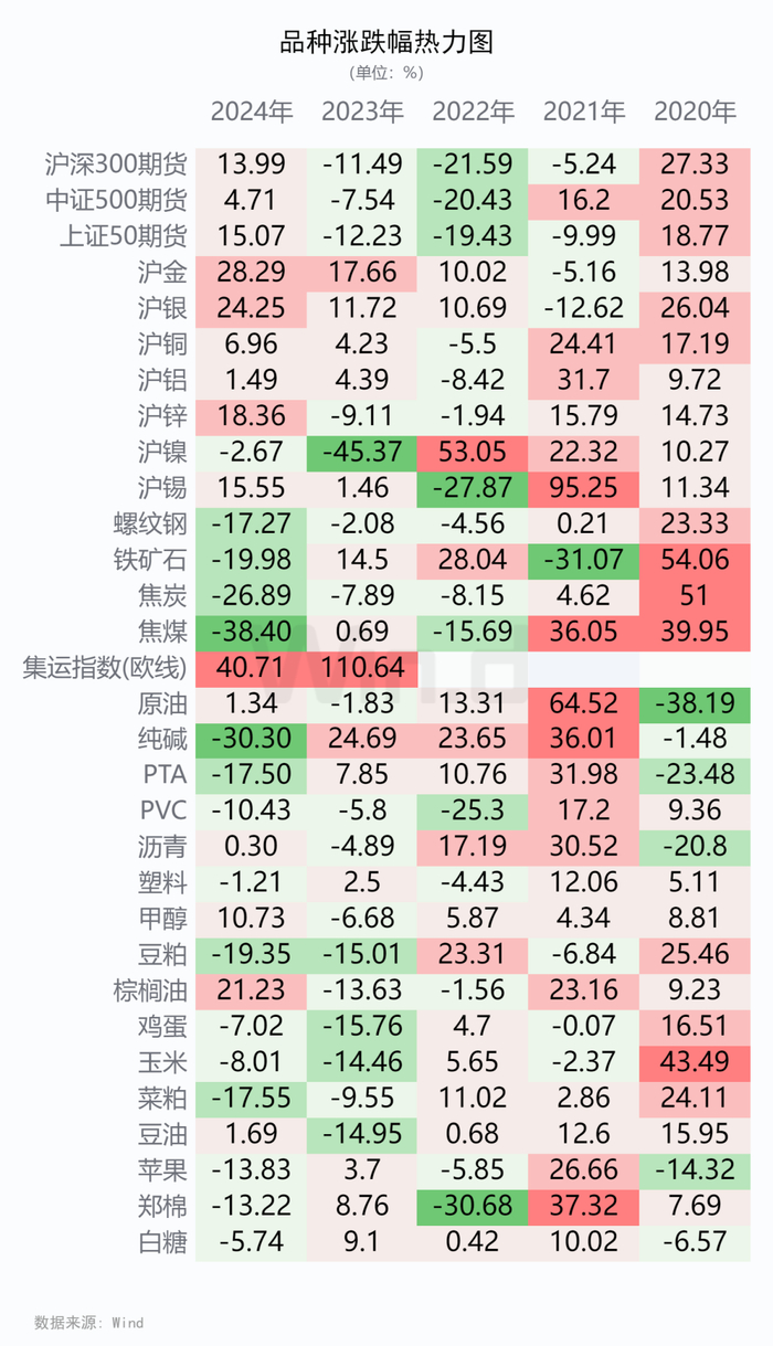 2024年商品跌多涨少,贵金属延续第二年上涨,有色金属走势强劲,农产品期货中油脂逆转2023年弱势,黑色及能化走势疲软。
