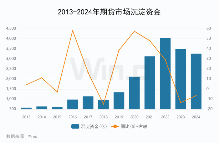 截止2024年12月底,国内商品期货市场沉淀资金3261.61亿元,同比下跌6.59%,沉淀资金连续两年流出。
