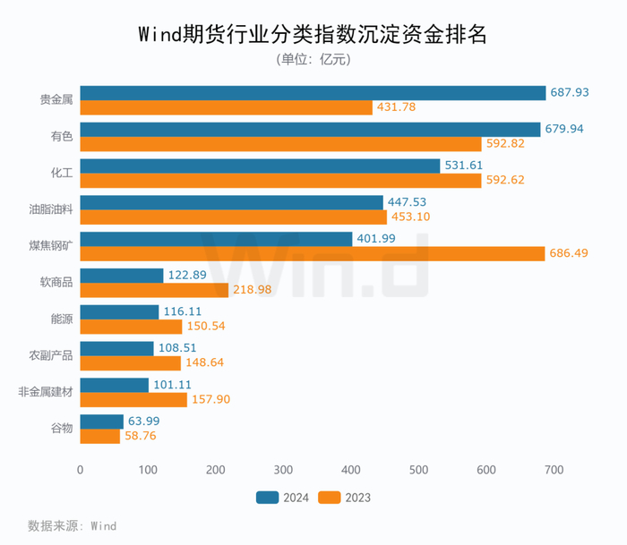 10个Wind行业中仅有3个行业出现了资金流入,流入金额最大的是贵金属行业,全年流入256.16亿元,同比增加59.33%。煤焦钢矿是流出资金最大的板块,流出资金284.5亿元;流出比例最大的是软商品行业,同比下降43.88%。