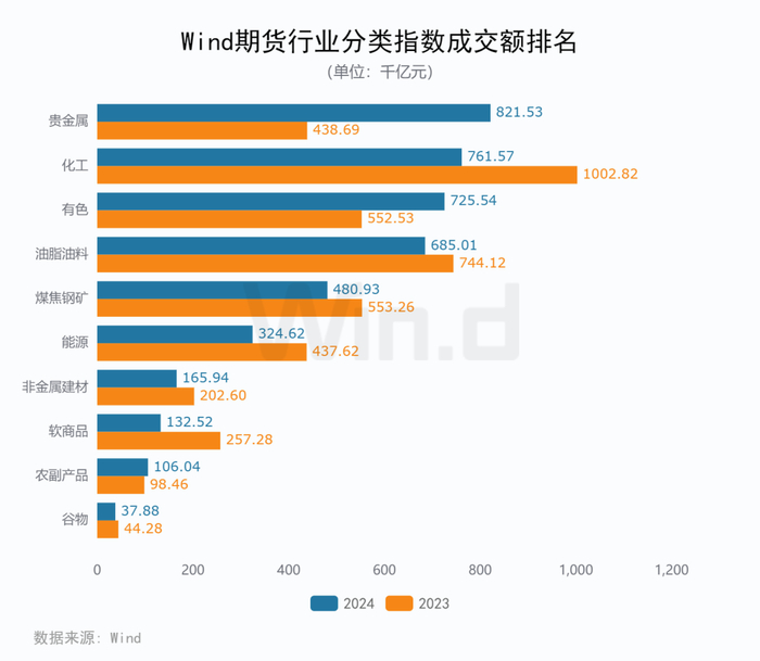 在10个Wind期货分类指数中,贵金属板块以82.15万亿元名列成交额第一,同比增加87.27%。有色板块成交额72.55万亿元,同比增加31.31%,农副产品板块成交额微增,化工成交额76.16万亿元,同比下降,其他6个板块成交额也出现下降。