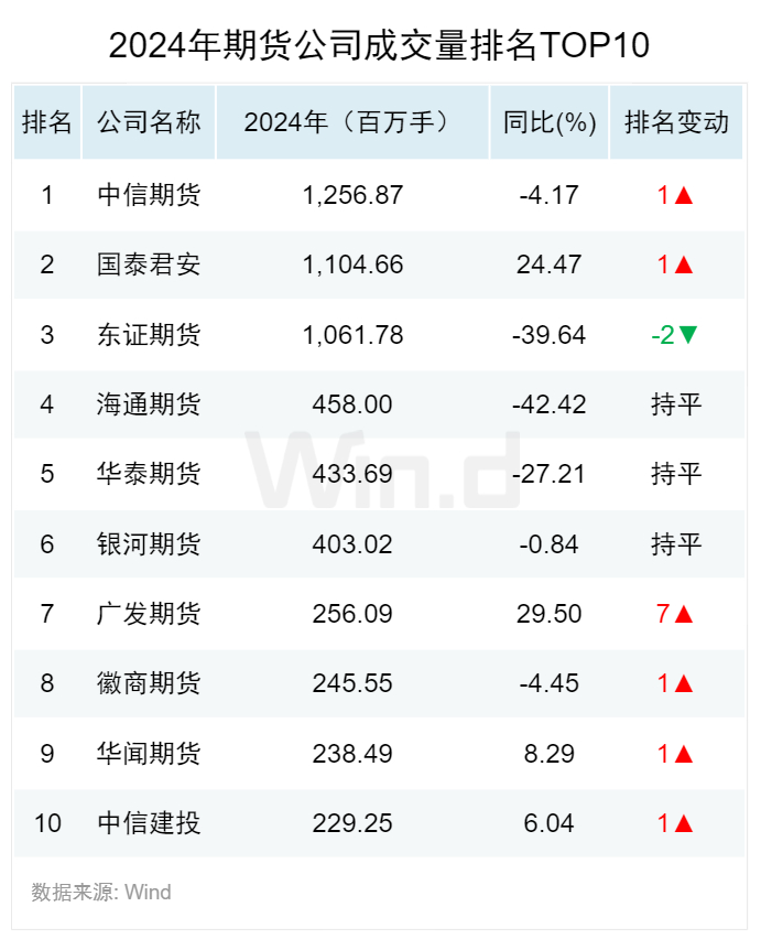 根据2024年期货交易所官网会员成交排名数据统计显示,中信期货以总成交量12.57亿手的成绩位列榜首,同比下跌4.17%。广发期货总成交量为2.56亿手,同比增加29.5%,总量排名上升7位,成交量同比增速最高。