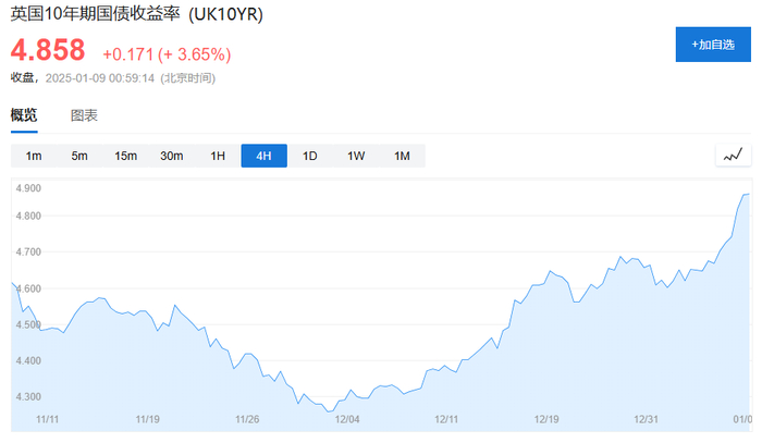 英国10年期国债收益率也攀升至4.82%,创2008年以来新高。就连日本10年期国债收益率也突破1%,达到10多年来的最高水平。