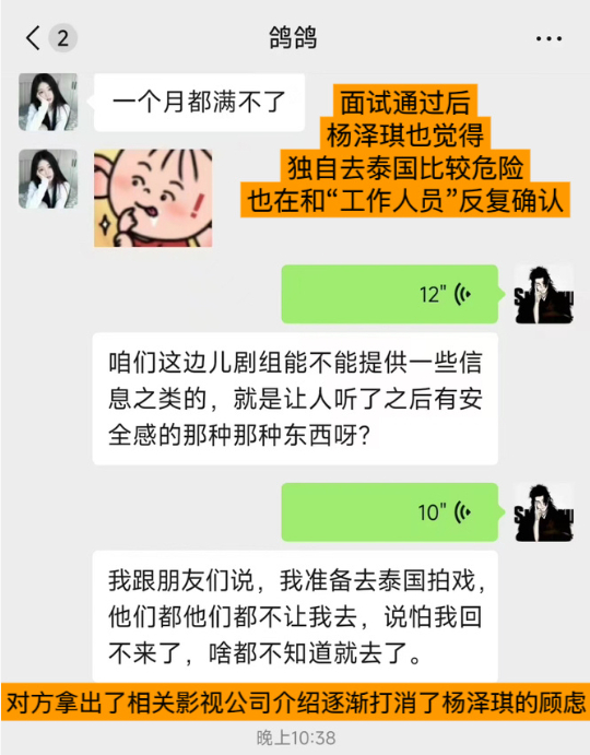 面试通过后,杨泽琪也觉得独自去泰国比较危险,也在和“工作人员”反复确认。对方拿出了相关影视公司介绍逐渐打消了他的顾虑。
