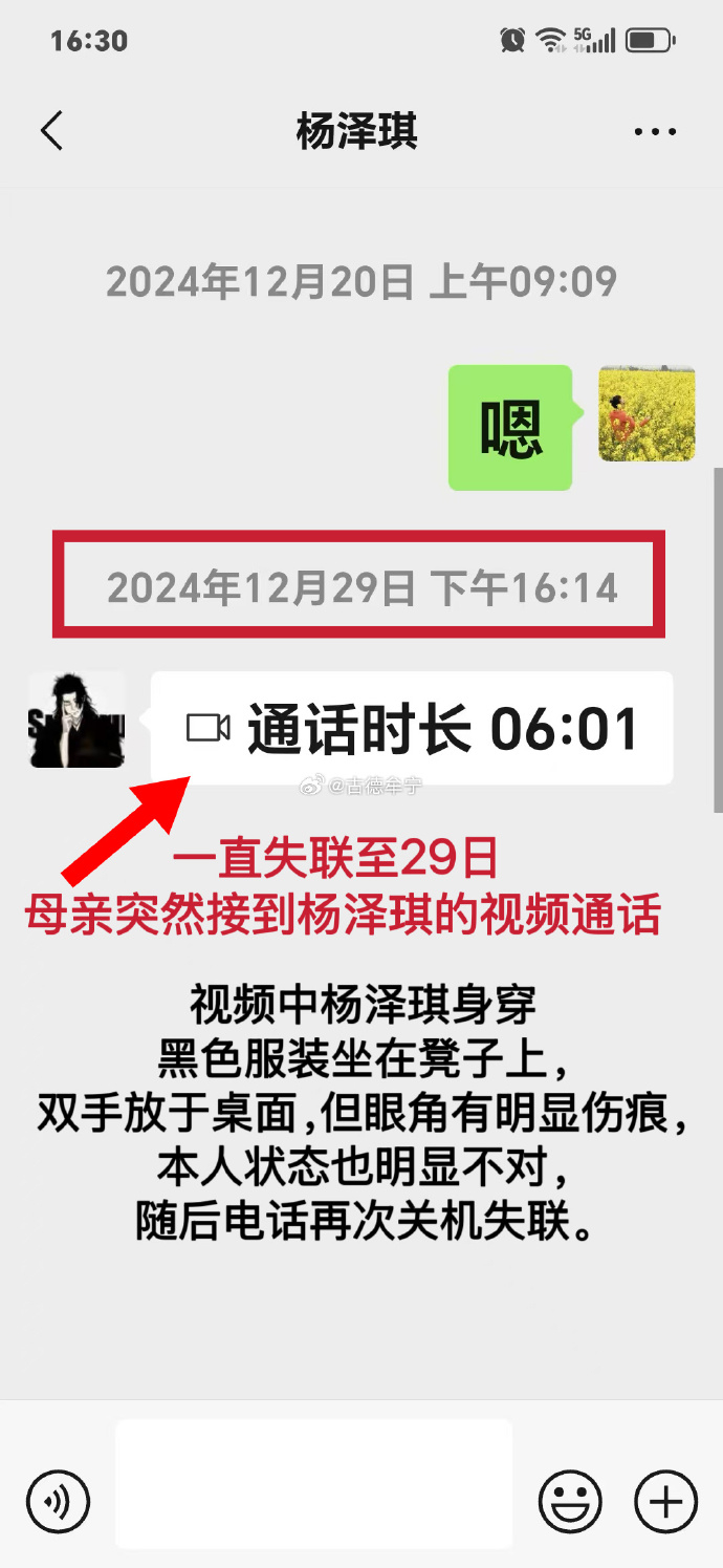 12月29日,与母亲打了视频通话报平安。视频中杨泽琪身穿黑色服装坐在凳子上,双手放于桌面,但眼角有明显伤痕,本人状态也明显不对,随后电话再次关机失联。