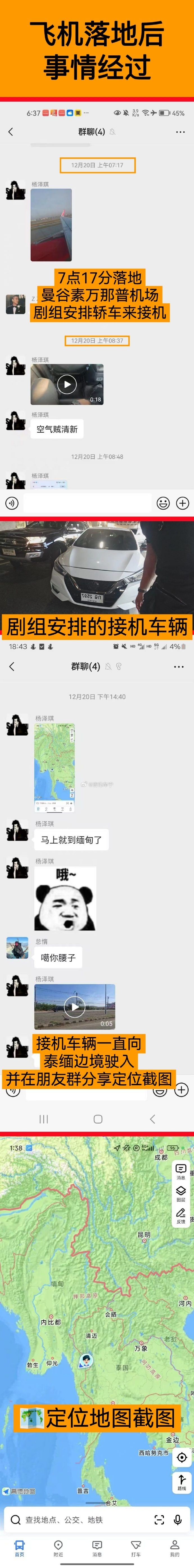 12月20日凌晨1:56,杨泽琪在北京大兴机场乘坐VZ3719航班,于当地时间6:16分抵达曼谷素万那普机场,落地后乘坐剧组接机车辆离开机场。北京时间14:59分换乘第二辆剧组安排的车辆,杨泽琪并截图地图软件,截图显示定位已经在泰缅边境。