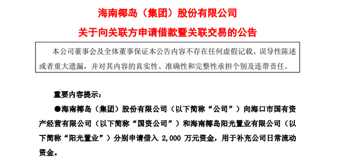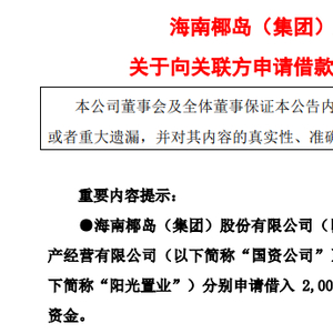 海南椰岛已经开始向大股东借款“救急”了。2024年12月底,海南椰岛公告,向控股股东海口市国有资产经营有限公司和公司持股40%的海南椰岛阳光置业有限公司各申请借入2000万元资金,用于补充公司日常流动资金,借款期限1年。