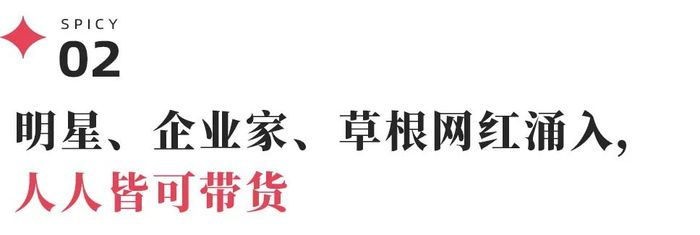 超头主播们在吃尽行业流量红利后陷入了增长瓶颈期,草根网红、流量明星艺人们逆袭、翻身的故事频频上演,亟待寻找增长曲线的企业家们杀进直播间试图开辟新的业务空间,觥筹交错之际,带货主播的边际不断扩张,人人皆可带货,直播电商的基本盘也在不断被扩大。