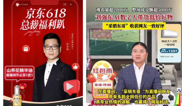 京东创始人刘强东则另辟蹊径,由分身“采销东哥”AI数字人亮相京东家电家居、京东超市采销直播间。虽未公布GMV,但根据京东超市披露,采销东哥AI数字人直播30分钟,直播间观看人数破千万;仅40分钟内,直播间观看人数超过1300万。