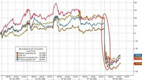 FactSet的数据显示,Rigetti Computing在周三收盘重挫了45.41%,IonQ则收跌39%。这两只股票当天的盘中跌幅均一度超过了50%,最终创下了有记录以来的最大单日跌幅。包括Quantum Computing等其他量子计算概念股也出现了类似的严重下跌。