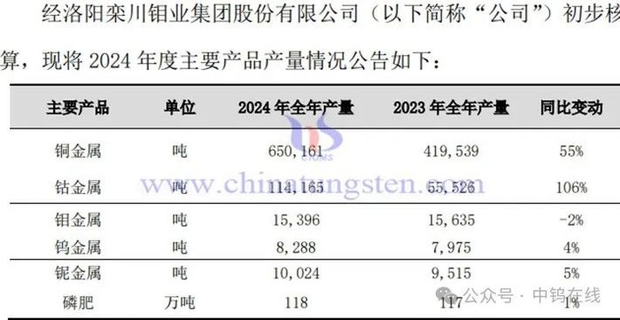 涨4%!洛阳钼业2024年钨金属产量近8300吨