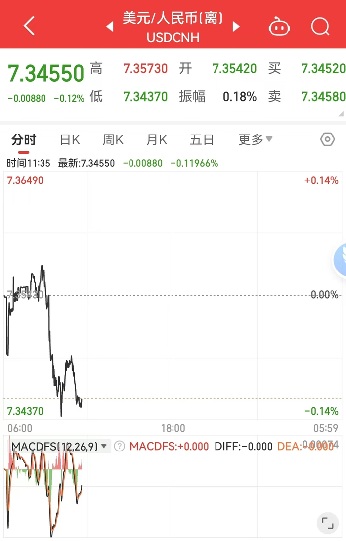 1月9日,离岸人民币兑美元较低点一度反弹近150点,收复7.35关口,现报7.34550元。