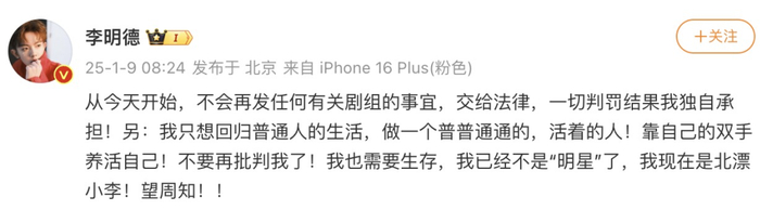 从今天开始,不会再发任何有关剧组的事宜,交给法律,一切判罚结果我独自承担!另:我只想回归普通人的生活,做一个普普通通的,活着的人!靠自己的双手养活自己!不要再批判我了!我也需要生存,我已经不是“明星”了,我现在是北漂小李!望周知!!