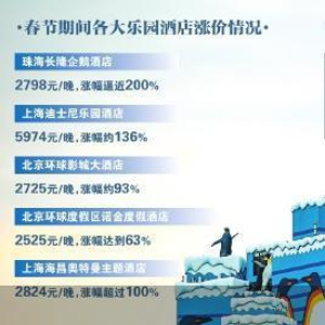 面向消费者端,途牛旅游网副总裁齐春光表示,热门主题公园内的酒店在春节期间出现涨价的现象非常常见,那么,消费者可以在主题公园或度假区周边选取距离合适的酒店,或是选择相关企业能够提供往返乐园接驳车的酒店入住,性价比会得到明显提升。
