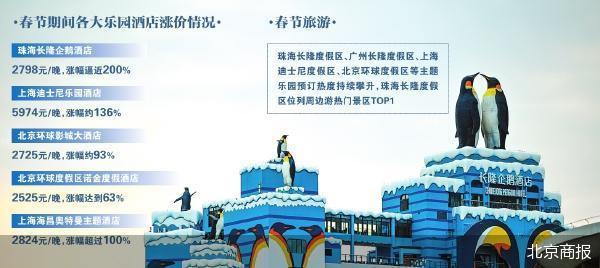 1月8日,北京商报记者调查发现,春节期间,珠海长隆企鹅酒店普通房型房价为2798元/晚,2月最低价格不足千元,涨幅逼近200%,超过国内一众顶级主题乐园酒店。在酒店房价上涨的同时,“外卖禁止入园”“门票套娃式收费”的吐槽频现社交媒体。更让消费者担心春节假期的出游体验。